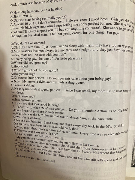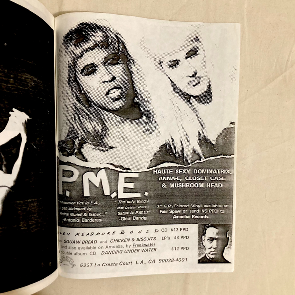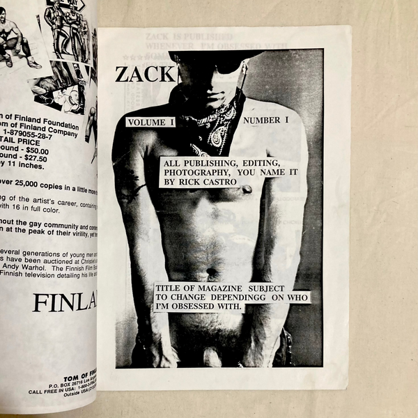 A scarce copy of Rick Castro's first zine. The only issue published under this name. Hard to find in any condition. The Pyewackett Productions order form in the back of The Bondage Book #4 describes Zack Magazine as "My first zine about my obsession with one hustler named Zack". Three pages of interview and many photos. Last page is an ad for Pedro, Muriel, and Esther's only 7" single on Amoeba Records from 1991. This single is Vaginal Davis' second appearance on record.