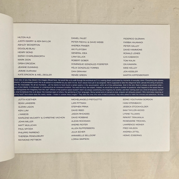 Artists featured: Hilton Als, Judith Barry & Ken Saylor, Ashley Bickerton, Douglas Blau, Henry Bond, Sarah Charlesworth, Mark Dion, Orshi Drozdik, Jeanne Dunning, Jimmie Durham, Kate Ericson & Mel Ziegler, Daniel Faust, Peter Fischli & David Weiss, Andrea Fraser, Aki Fujiyoshi, General Idea, Liam Gillick, Robert Gober, Dominique Gonzalez-Foerster, Felix Gonzalez-Torres, Dan Graham, Renee Green, Federico Guzman, Fariba Hajamadi, Peter Halley, David Hammons, Ronald Jones, Ilya Kabakov, Tom Kalin, On Kawara, Mike Kelley, Jon Kessler, Martin Kippenberger, Jutta Koether, Sean Landers, Glenn Ligon, Ken Lum, J. Mascis, Marlene McCarty & Christine Vachon, John Miller, Matt Mullican, Paul Myoda, Philippe Parreno, Theresa Pendlebury, Raymond Pettibon, Michangelo Pistoletto, Lari Pittman, Stephen Prina, David Reed, Jason Rhodes, David Robbins, Alexis Rockman, Andrei Roiter, Allen Ruppersberg, Julia Scher, Annabelle Selldorf, Lorna Simpson, Sonic Youth / Kim Gordon, Haim Steinbach, Jessica Stockholder, Sam Taylor-Wood, Lynne Tillman, Rirkrit Tiravanija, Rosemarie Trockel, Lawrence Weiner, Fred Wilson, Andrea Zittel, and Heimo Zobernig.