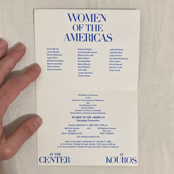 Uncommon exhibition invitation featuring women artists that took in place in two venues: Center for Inter-American Relations and the Kouros Gallery. Ana Mendieta was one of the artists featured, this exhibition took place three years before her murder.