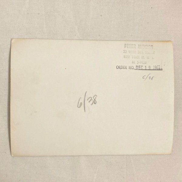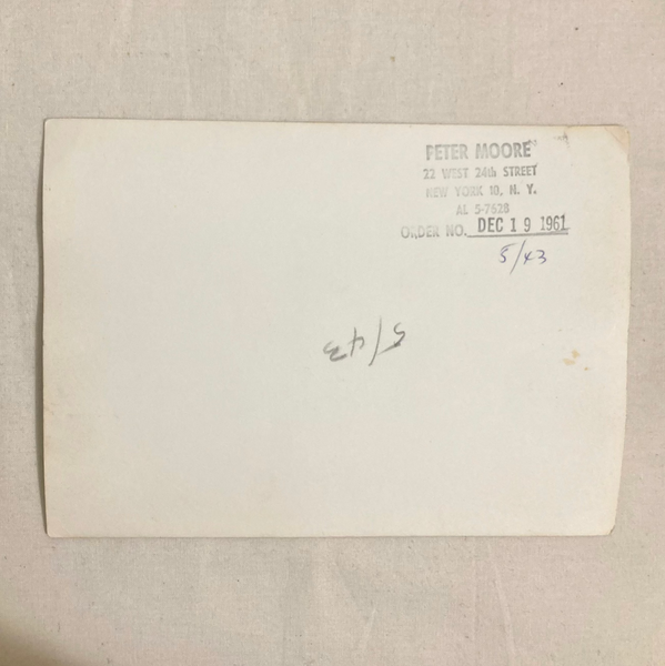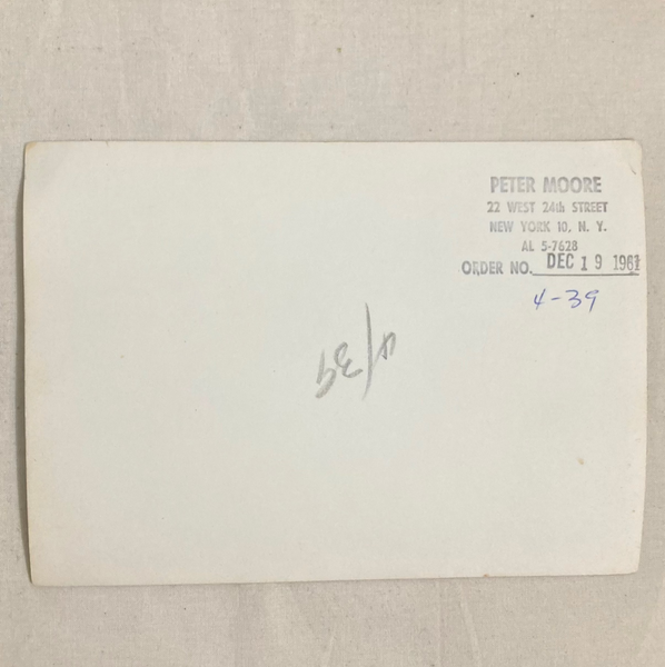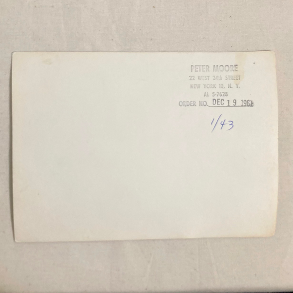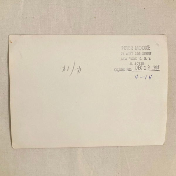 "Peter Moore 22 West 24th Street New York 10, N.Y. AL-5-7628 Order No. Dec 19 1961".