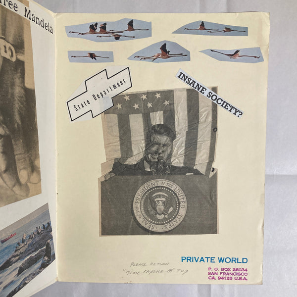 Unique book of collages by Padin illustrating in stark and at times comical ways the insanity of war, hunger, poverty, empty subculture, racism, etc and made in response to Private World's (a.k.a. Iain G. Hamilton) "Time Capsule" project. Hamilton mailed blank portfolios to select correspondence artists, intended for them to customize with their art and return.