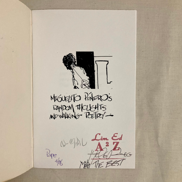 Transcribed and edited by Manuel D. Lezcano, with illustrations by the graffiti writer / now graffiti historian Chris Pape also known as Freedom. This copy is letter N in the limited signed edition of 26, lettered A-Z, signed by Miguel Pinero, Chris Pape, and Manuel D. Lezcano.