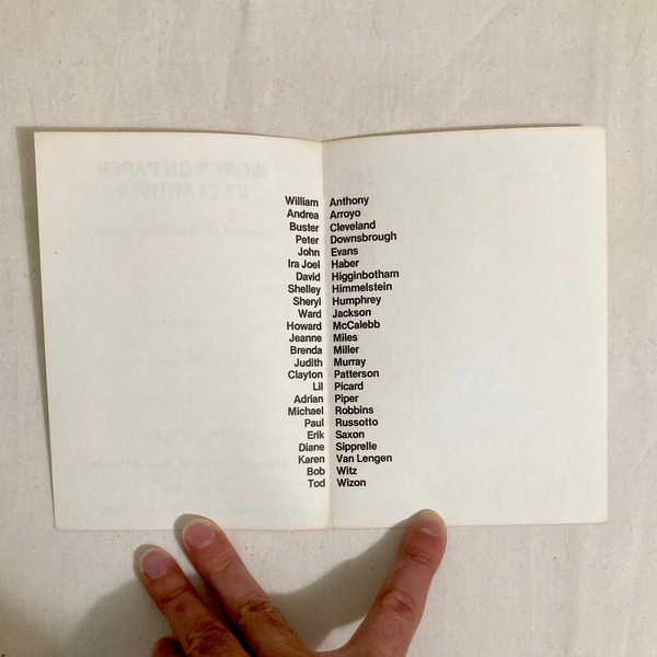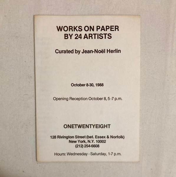 Uncommon exhibition brochure for a group show entitled Works on Paper by 24 Artists. curated by Jean-Noël Herlin that took place at Onetwentyeight Gallery in 1988.