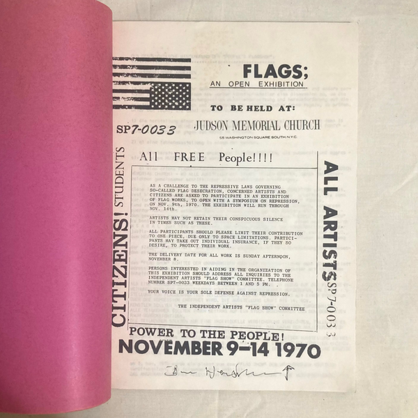Scarce copy of this Reflection Press title documenting the People’s Flag Show at Judson Church and the subsequent arrest, legal challenges, and fundraising for Faith Ringgold, Jean Toche, and Jon Hendricks who were arrested for desecrating the flag of the United States of America. Reproductions of flyers, correspondence, court documents, German fundraising efforts, etc.