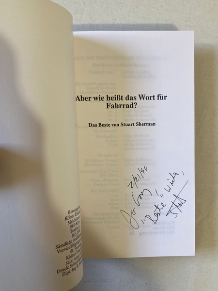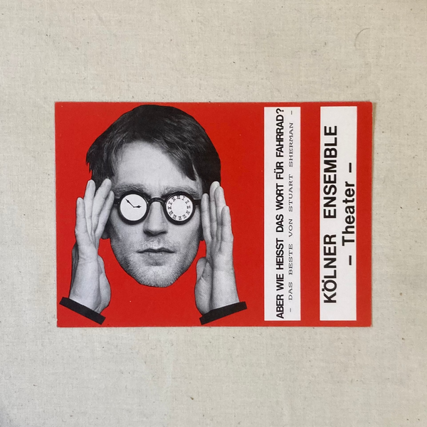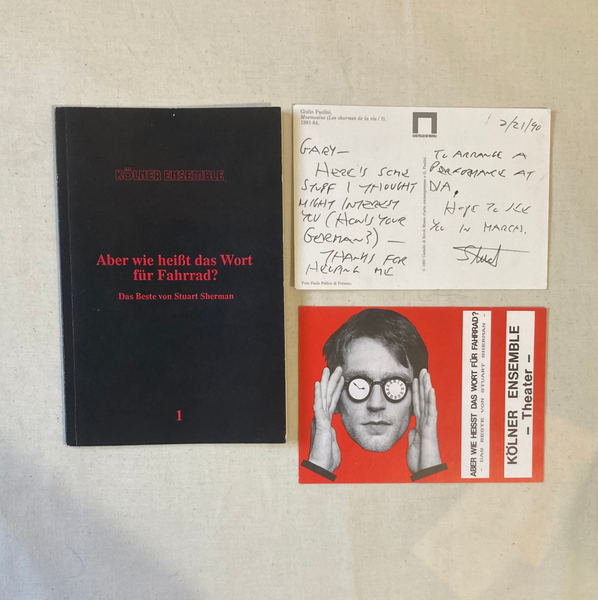 Published by the Kölner Ensemble to accompany their Stuart Sherman performances in 1990. The book has three sections: Die Stücke which consists of the scripts for 10 plays including It Is Against the Law To Shout "Fire" In A Crowded Theater and But What is the Word for Bicycle?, Der Autor and Die Inszenierung.