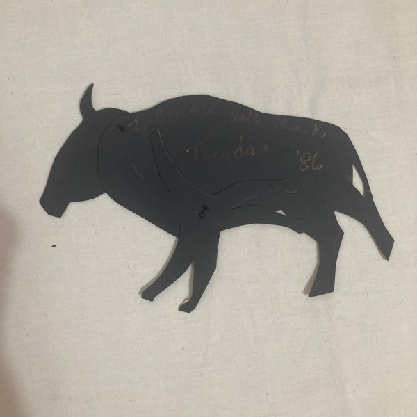 A handmade paper Buffalo Gal with moveable head and front legs inscribed by Theodora Skipitares: